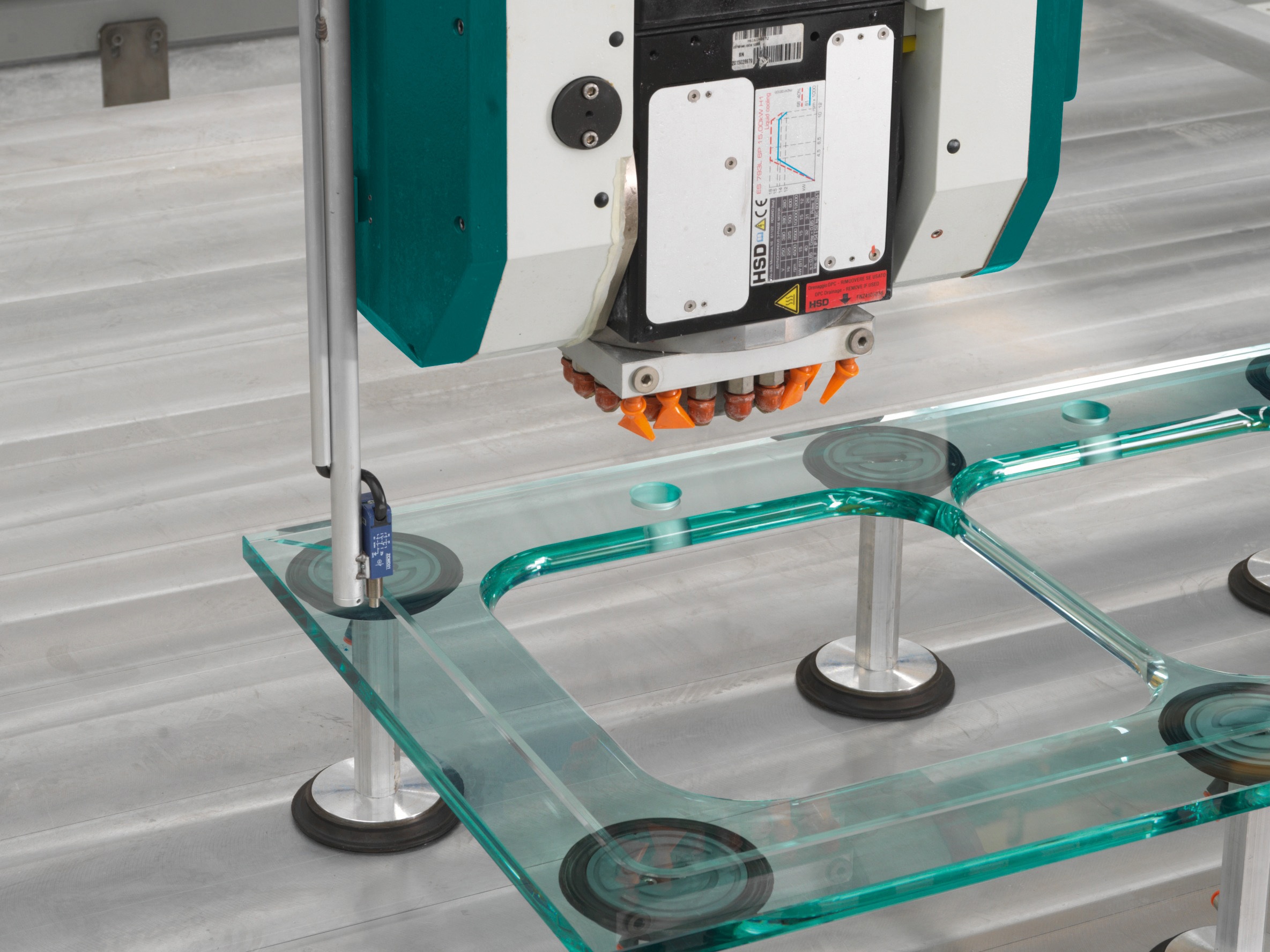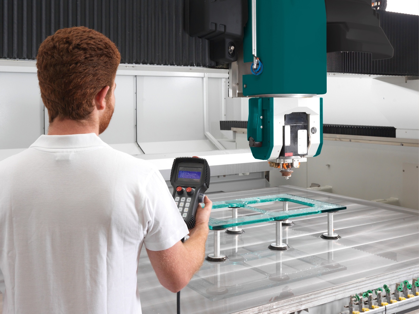 The machine is available in Version M and in three sizes – 33, 38, and 45 – with working areas up to 4,500 × 2,500 mm, depending on configuration. Maximum glass thickness is 100 mm, making the machine suitable for architectural glass, mirrors, technical glass, and special applications.