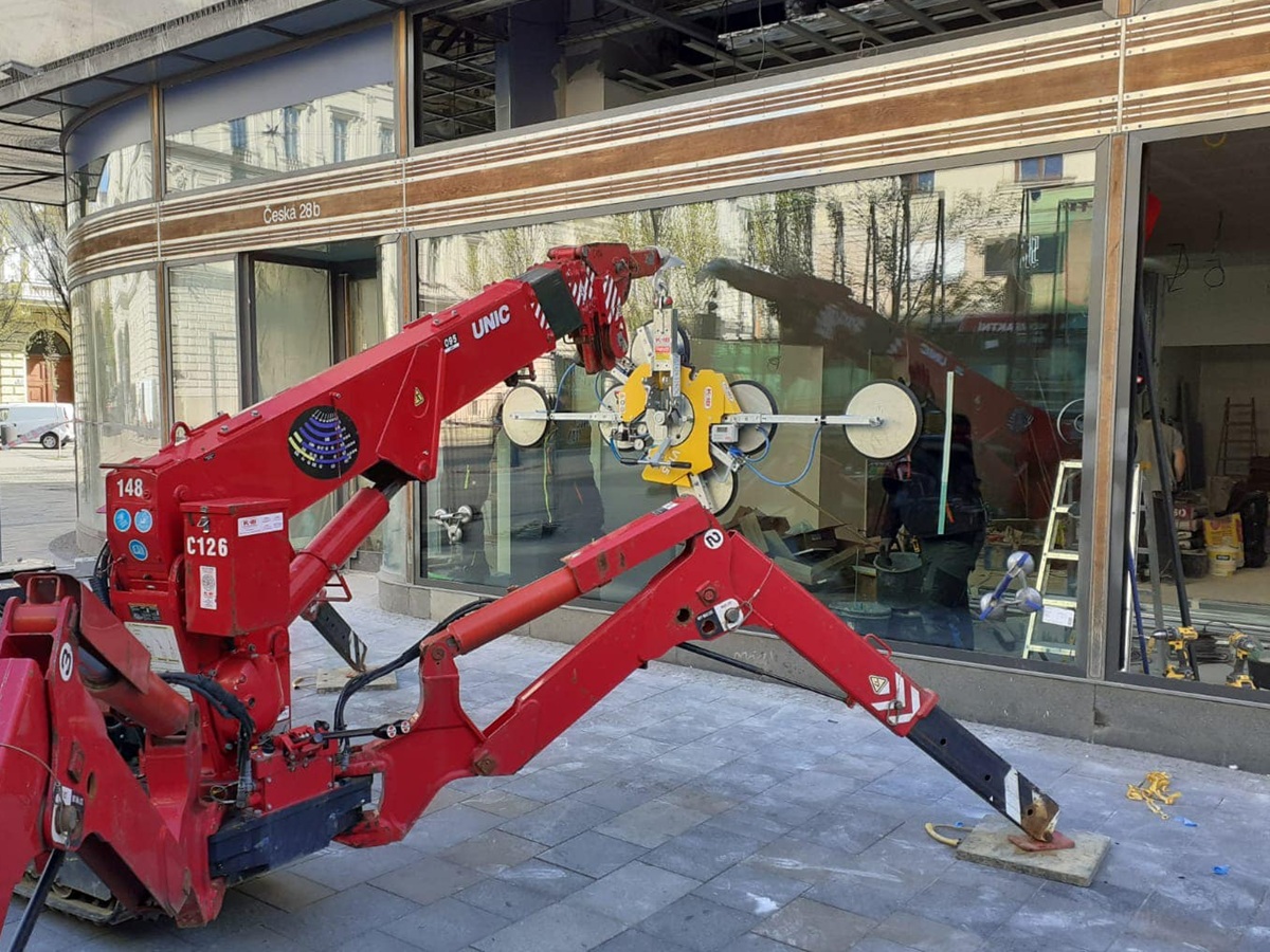 The lifter is equipped with eight round suction cups with a diameter of 390 mm. Four suction cups are mounted centrally on the frame, while four are placed on removable arms. Depending on the setup, the lifter can be configured with 2, 4, 6, or 8 suction cups, providing a lifting capacity from 300 kg up to 1200 kg.
