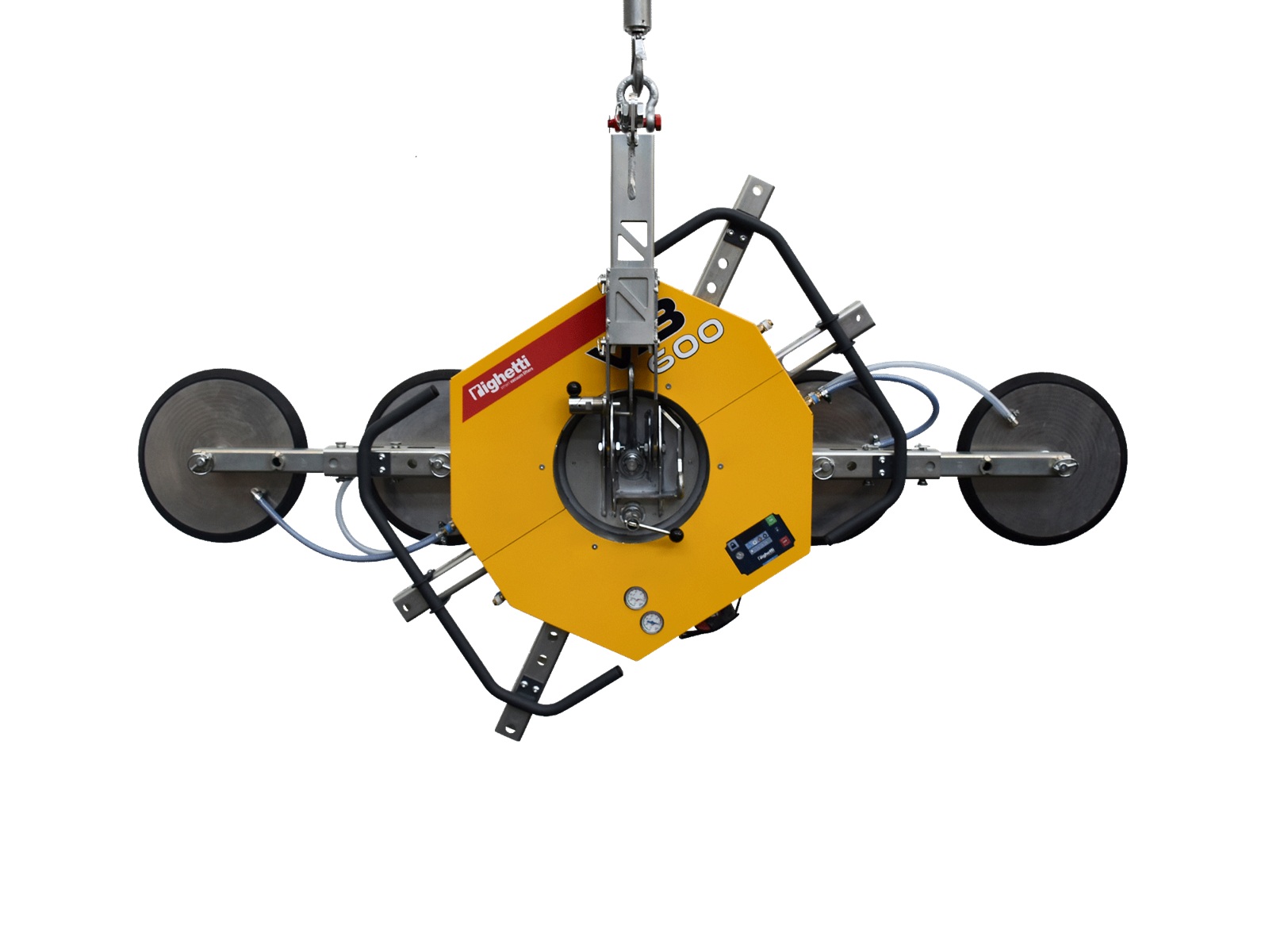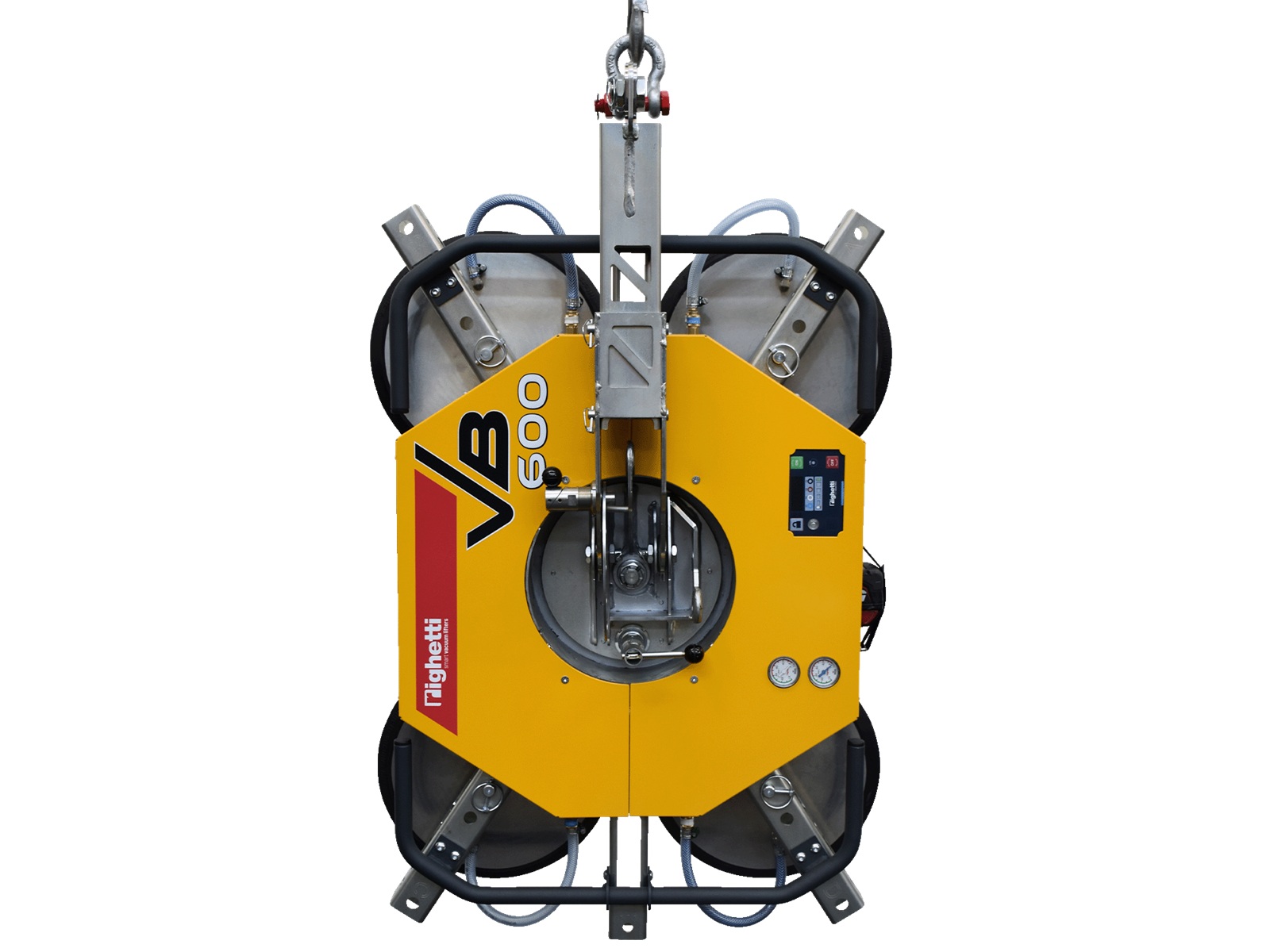 As standard, VB600 is equipped with four suction cups of Ø315 mm, a double vacuum circuit for increased safety, 360° continuous rotation, and 0–90° tilt. The suction cups can be repositioned to suit different panel formats, and the lifter supports both horizontal and vertical handling.