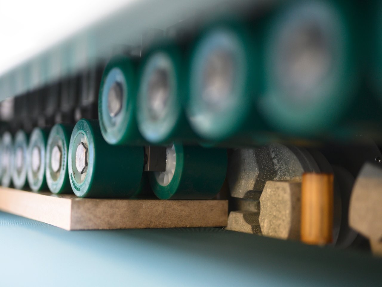 Master Edge Up F H is available in multiple configurations, with different arrangements of front polishing wheels and chamfers depending on production requirements. The motorised chamfer units are automatically positioned, and the pressure roller system with duplex presses ensures stable clamping – also for thin materials and frame parts.
