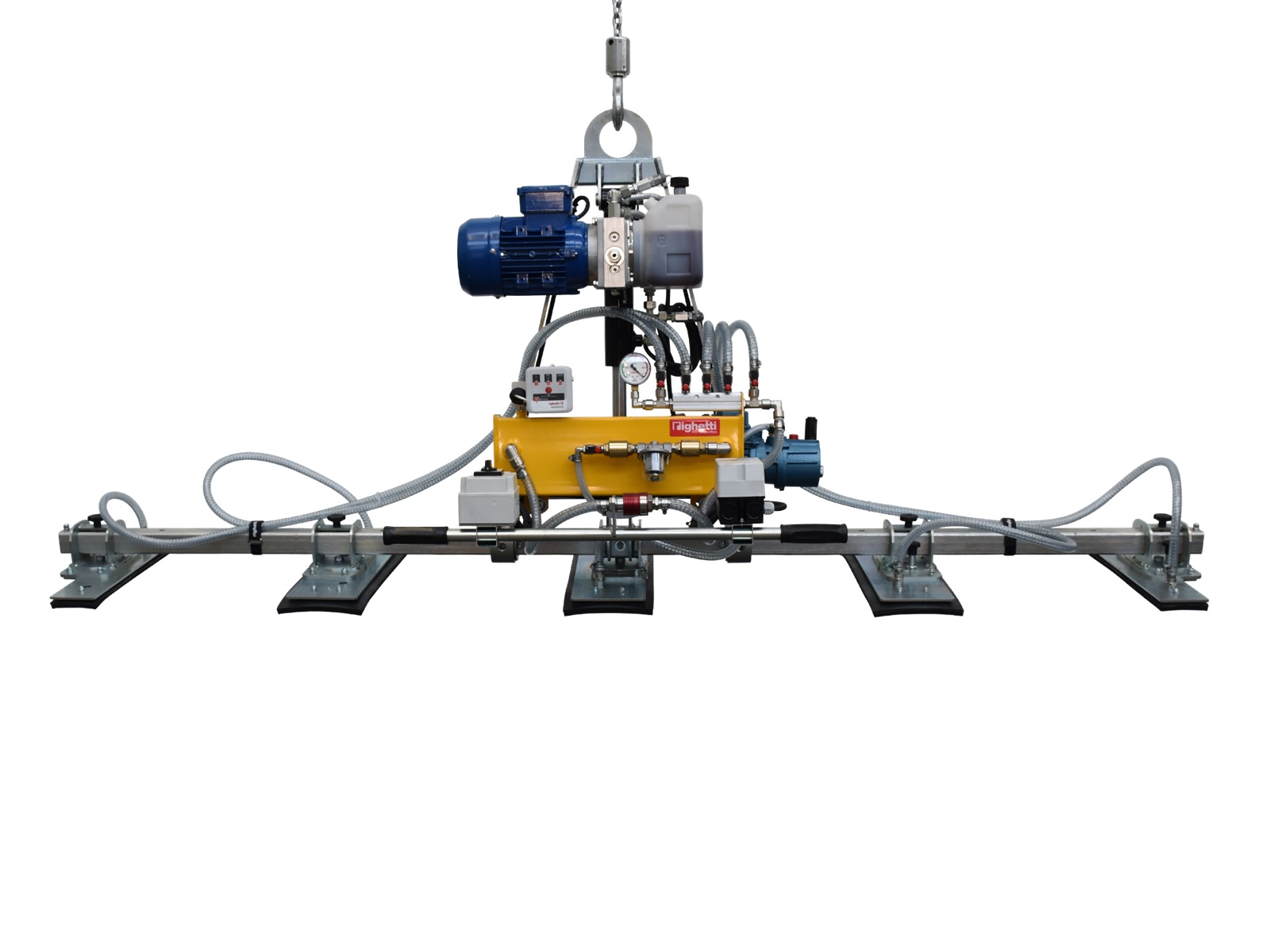 The machine is equipped with 5 rectangular suction cups (580×180 mm) mounted on a 2200 mm long lifting beam. Each suction cup can be rotated 90°, providing flexibility in placement and handling. The vacuum system includes a vacuum tank, check valve, and an efficient dust and condensate filter that protects the system and provides quick suction.