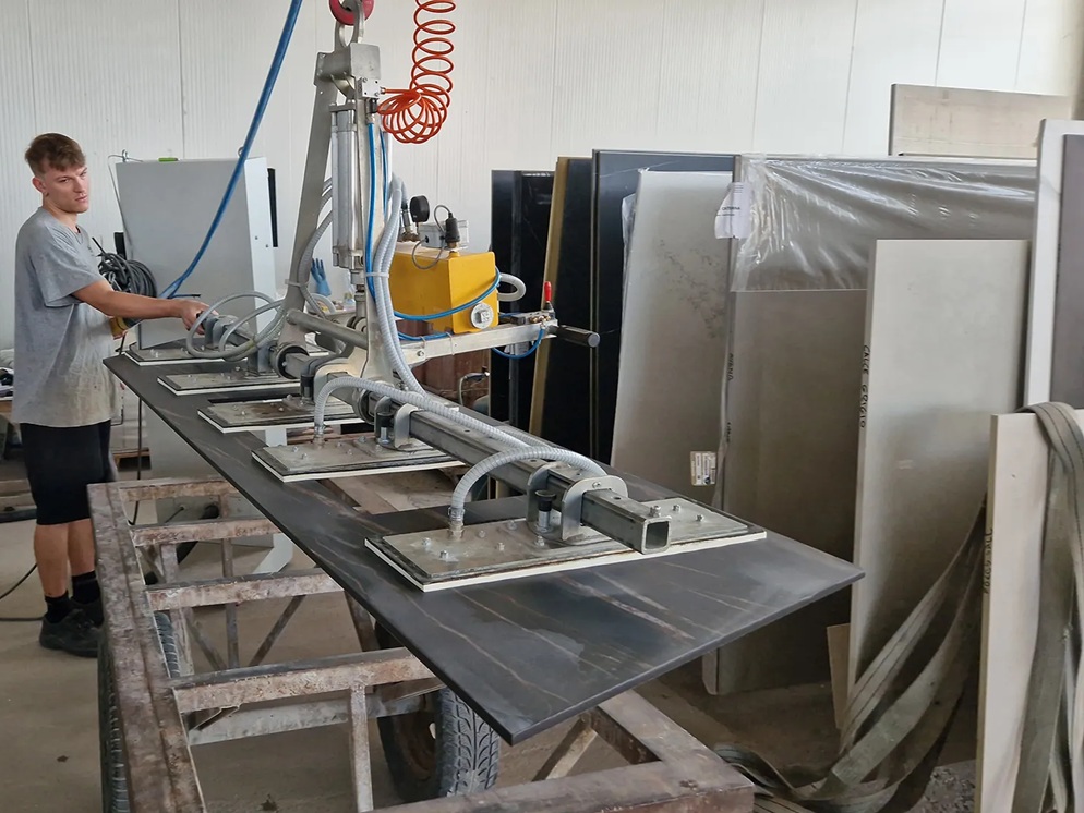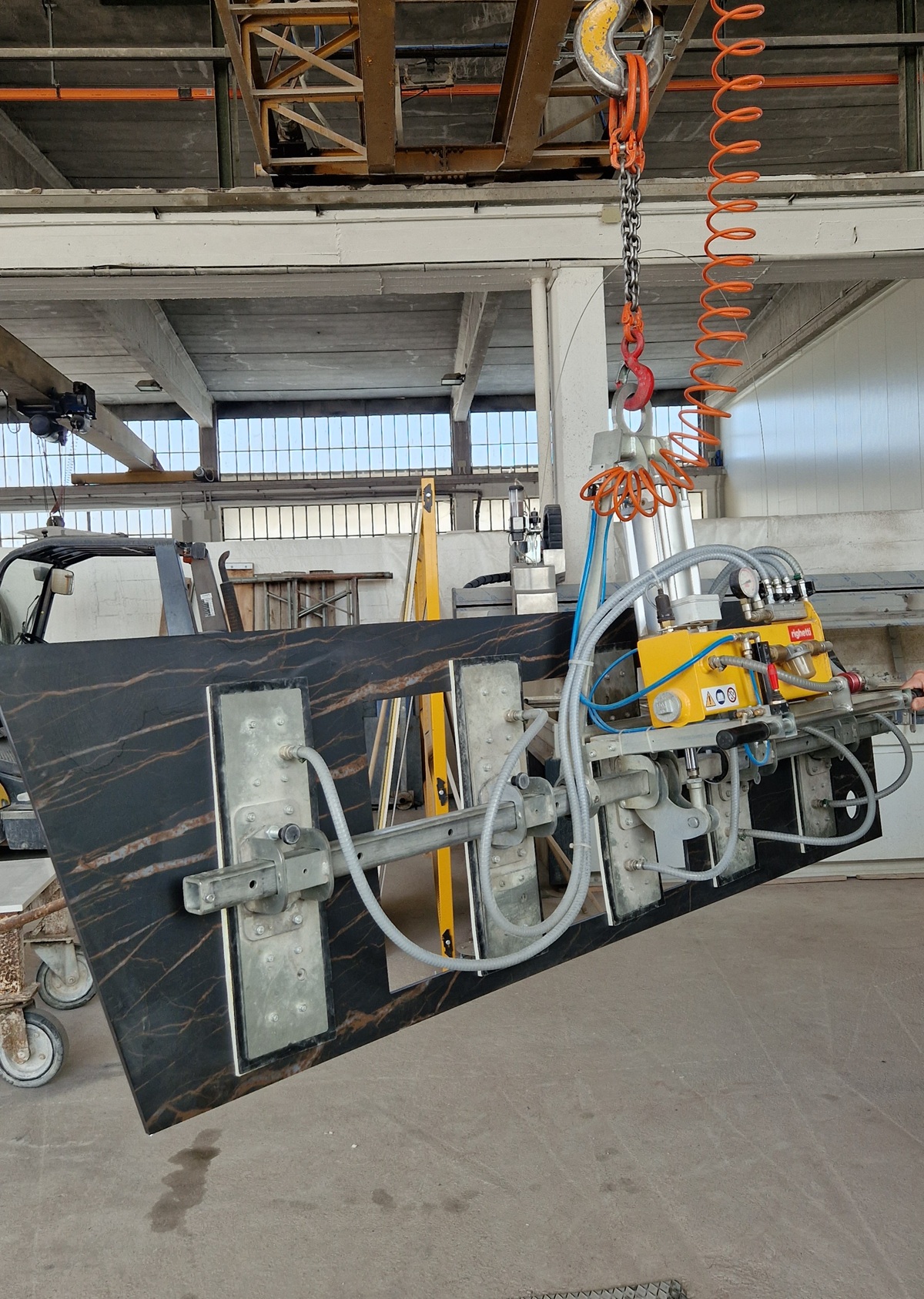 Righetti P5A550K is a pneumatic vacuum lifter developed for handling kitchen countertop slabs and other long slabs in natural stone, ceramics, and similar non-porous materials. The vacuum lifter is used as a lifting cradle together with a crane, forklift, or other suitable lifting equipment and is designed for both horizontal and vertical handling.
