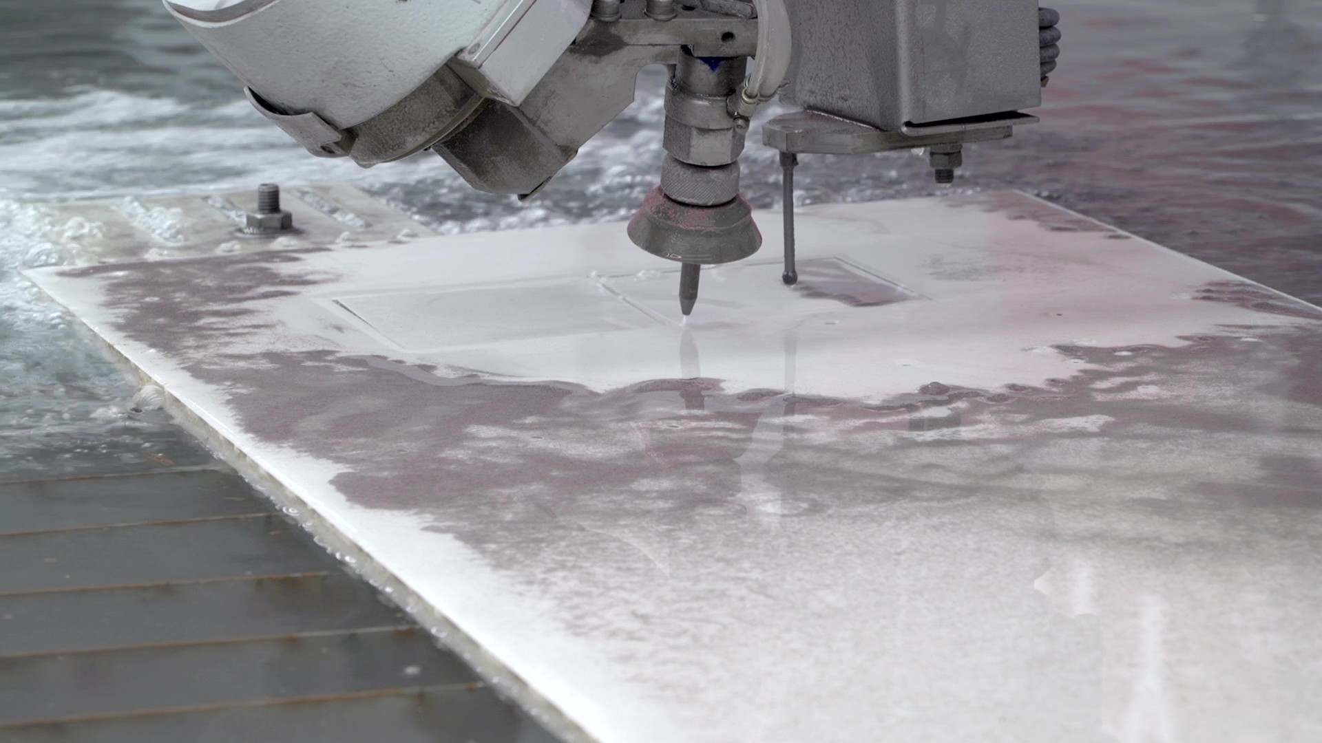The patented 5-axis cutting head with infinitely rotating C-axis enables angled cuts up to ±60°. This ensures a stable abrasive flow and consistent cut quality – even for complex profiles and details.